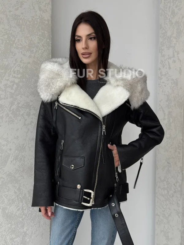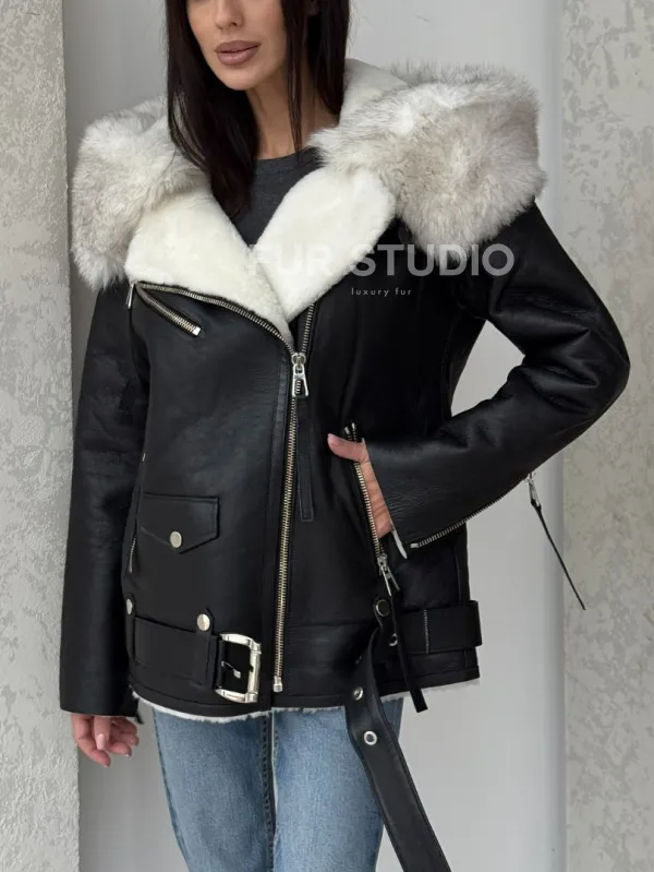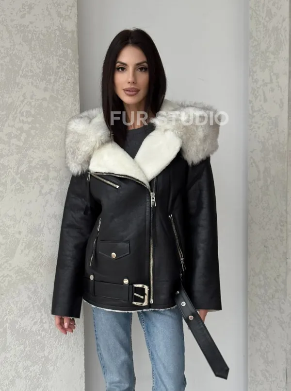 Черная куртка дубленка с капюшоном. Модель предлагается в размерах от 42 до 54. Оптимальная длина моделей 60-65 см подчеркивает линии вашей фигуры. Эта дубленка станет неотъемлемой частью гардероба для тех, кто предпочитает роскошь и утонченность натуральной кожи.