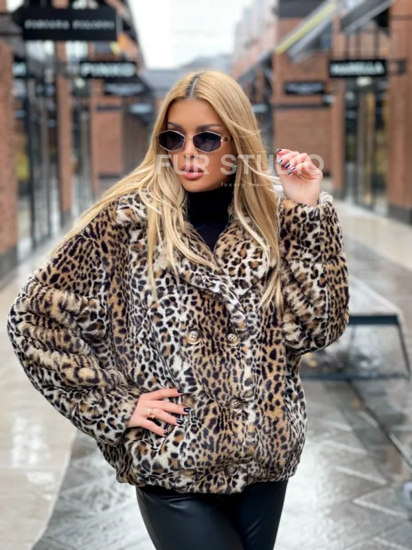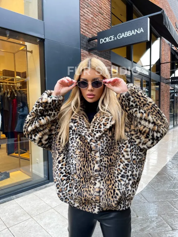 Короткая шуба под леопард из экомеха – выбор девушек, которые идут в ногу со временем. Изделия из экомеха прекрасная альтернатива для тех, кто хочет выглядеть стильно, но бюджет ограничен. Оптимальная длина комфортна в носке и не сковывает движение, что удобно при вождении машины. Теплый мех согреет в прохладное время года. Широкие рукава подчеркнут изящество кистей.